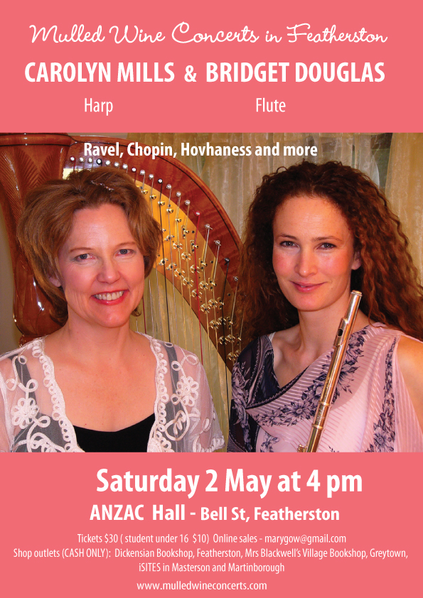 Mulled Wine Concerts, the Kapiti-based music organisation run by Mary Gow will be producing a flute and harp concert on May 2 in Featherston which will delight local concert-goers.
